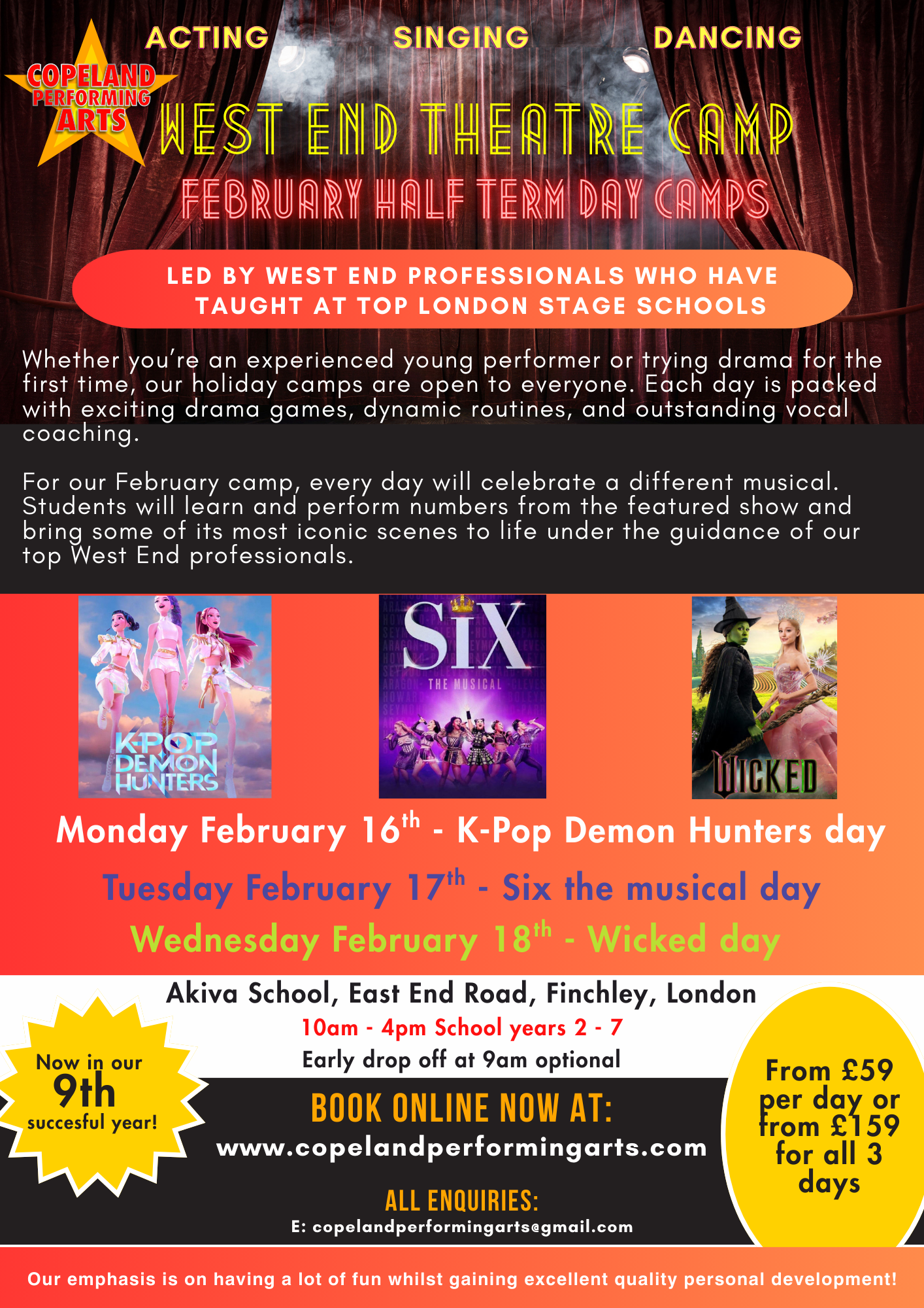 Both age groups will create an ensemble drama piece and stage a selection of amazing songs from West End musicals with our top West End professionals, all culminating in a performance for parents on the final day.